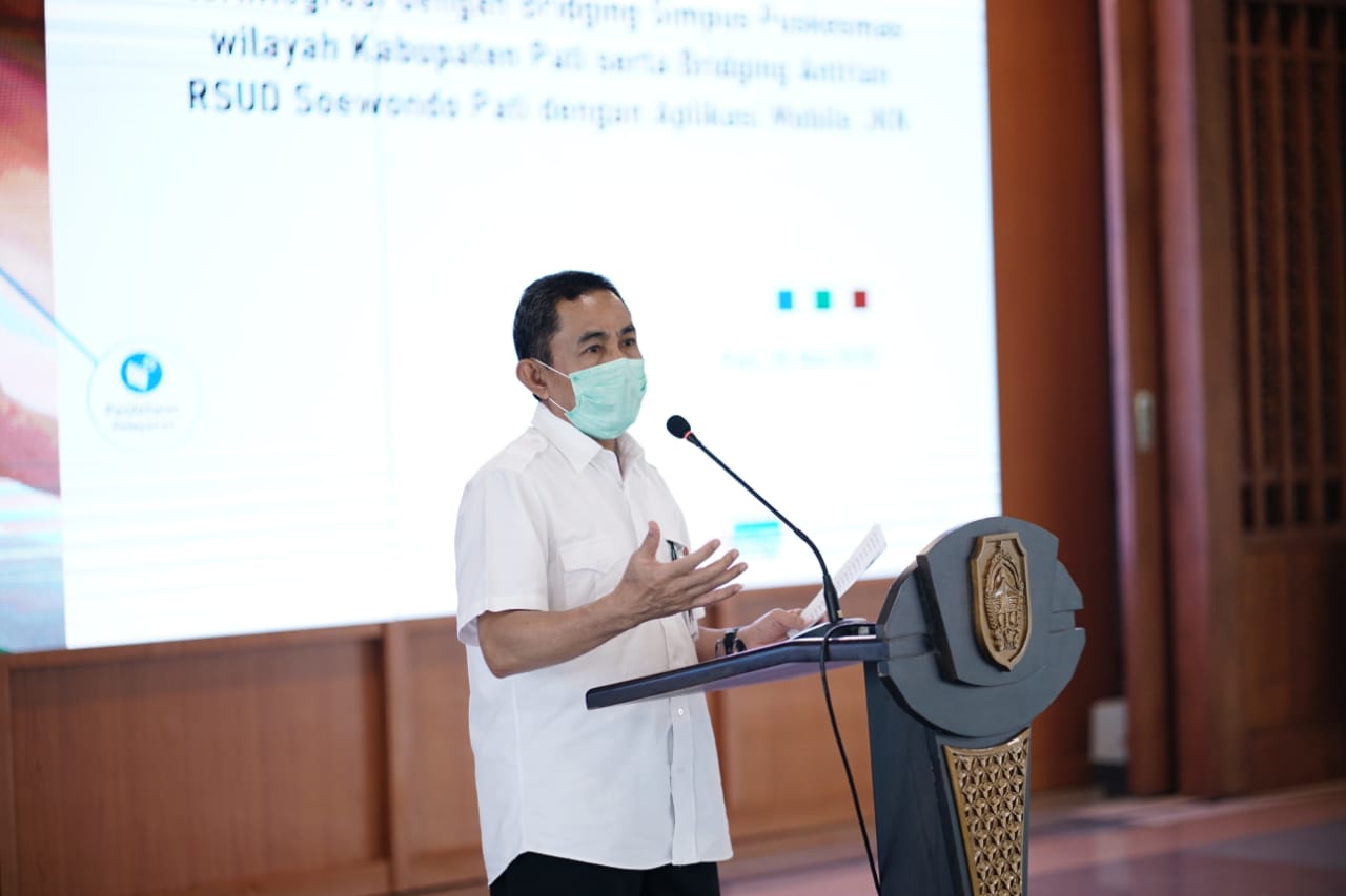 Pati – Kilaspersada.com, Bertempat di Pendopo Kabupaten Pati, Bupati Pati Haryanto bersama Sekretaris Daerah Kabupaten Pati Suharyono dan Kepala BPJS Kabupaten Pati, Kamis (28/5), melaksanakan Launching Sistem Antrian Online Terintegrasi dengan Bridging Simpus Puskesmas