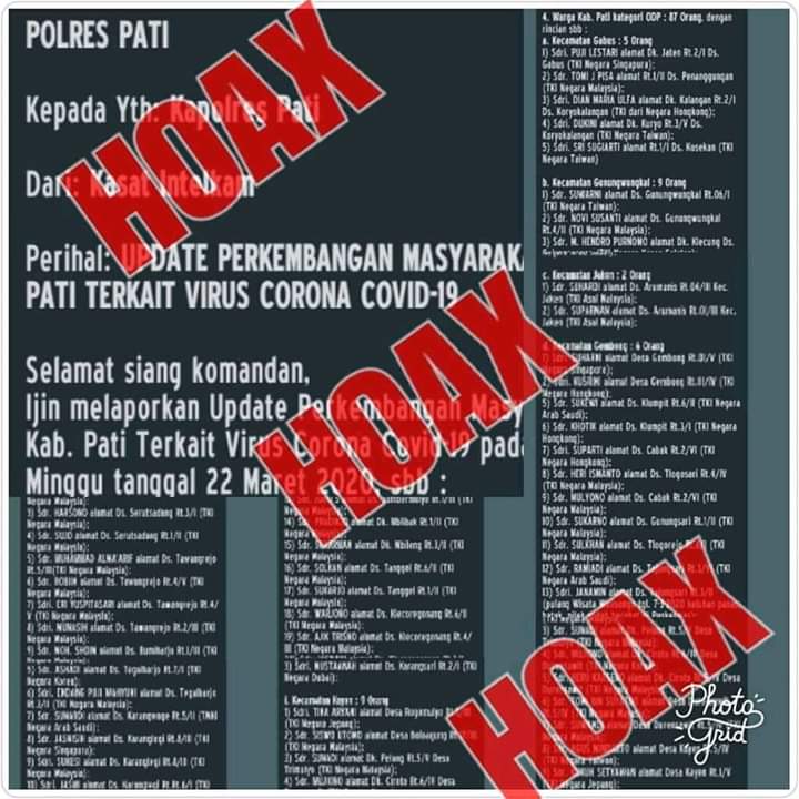 Kapolres Pati AKBP Arie Prasetya Syafa’at melalui Kasat Intel AKP. Yun Iswandi memberi keterangan lewat Whatsapp bahwa “itu sudah jelas-jelas hoax tolong bantu informasikan ke teman – teman itu hoax,”tuturnya. Minggu, (22/03/20)