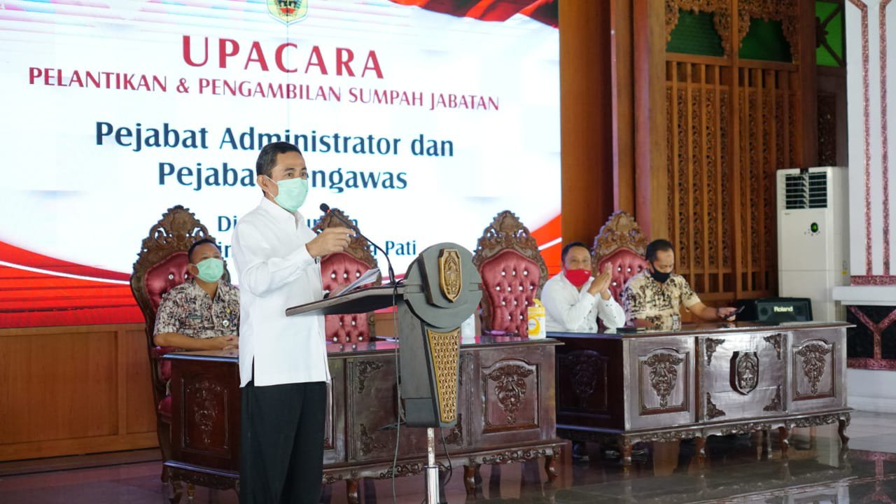 Pati-Kilaspersada.com, Bupati Pati Haryanto didampingi Wakil Bupati Pati Saiful Arifin (Safin), Sekda Pati Suharyono, dan Plt Kepala Badan Kepegawaian Pendidikan dan Pelatihan (BKPP) Jumani, hari ini (4/6) melantik dan mengambil sumpah empat Pejabat Administrator (eselon III – red) dan 13 Pejabat Pengawas (eselon IV-red) di Pendopo Kabupaten Pati.