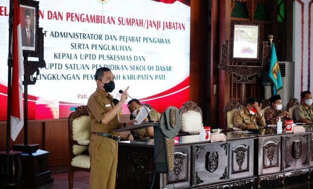 Bupati Pati Haryanto menyampaikan ucapan selamat kepada 62 pejabat struktural, 2 Kepala Puskesmas dan 11 Kepala Sekolah yang dilantik dan dikukuhkan pada kesempatan ini.