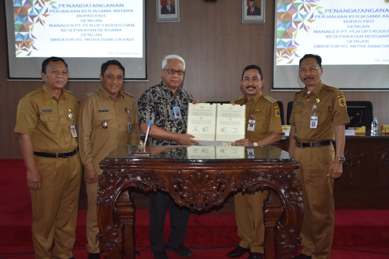 Pati – Kilaspersada.com, Bupati Pati Haryanto hari ini menandatangani perjanjian kerjasama dengan PT PLN UP3 Kudus dan RS Mitra Bangsa di ruang Penjawi Setda Pati.