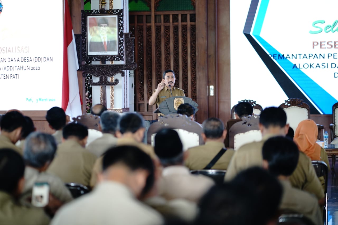 Pati – Kilaspersada.com, Seluruh kepala desa di Kabupaten Pati hari ini mengikuti Sosialisasi Pemantapan Pengelolaan Dana Desa (DD) dan Alokasi Dana Desa (ADD) 2020 yang digelar Pemkab Pati di Pendopo Kabupaten Pati.