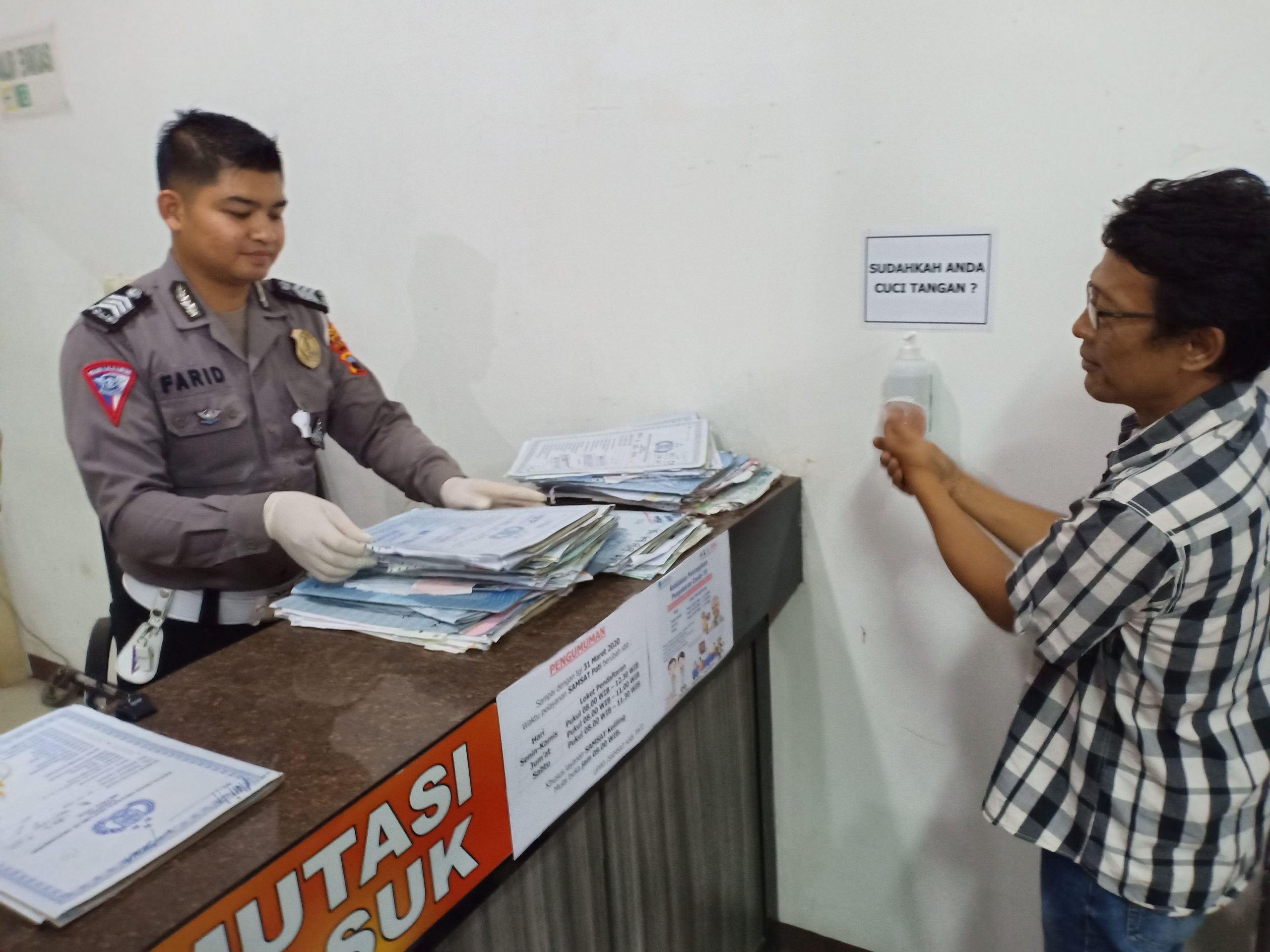 Pati – Kilaspersada.com, WajibPajak di Samsat Pati sebelum masuk ruangan Samsat di cek suhu tubuh, wajib pajak juga haruskan untuk cuci tangan dengan hand satinizer yang telah disediakan oleh pihak UPPD Kabupaten Pati . Kamis (19/03/20)