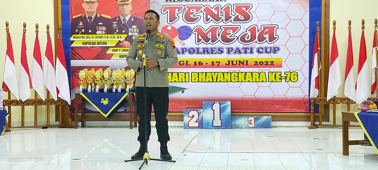 Kilaspersada.com Pati-Dalam rangka HUT Bhayangkara ke 76 Polres Pati bekerjama dengan KONI PATI dan (PTMSI) persatuan tenis meja seluruh Indonesia kab. Pati, yang di selenggarakan pada tanggal 16 – 17 Juni 2022 memperebutkan piala Kapolres Pati yang diikuti kelompok umur, U – 12, U – 16, umum atau open dan Polri. Kejuaraan ini digelar di gedung PGRI di jalan syeh jangkung no 135 Pati, jumat tgl (17/06/22).