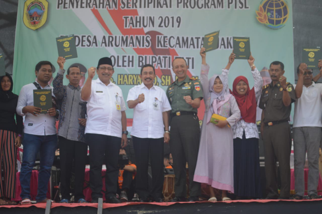 Dalam acara penyerahan sertifikat di desa Arumanis, desa Srikaton Kecamatan Jaken dan desa Trimulyo kecamatan Juwana, Bupati Pati H. Haryanto, SH, MM, M, Si didampingi oleh Dandim 0718/Pati Letkol Arm Arif Darmawan, S.Sos, Kepala BPN Kabupaten Pati Yoyok Hadimulyo Anwar, SH, Plh. Ka Kejaksaan Heru Haryanto, SH ( Kasi Pidsus Kejaksaan Pati).