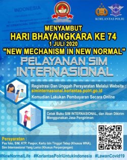 Kasatlantas Pati AKP Abdul Mufid, SH.,MH., Melalui Baur SIM AIPTU Moch. Riva’i, SH., menjelaskan kepada media bahwa saat menghadapi tatanan baru ini atau new normal ini, warga tidak perlu datang ke kantor Korlantas untuk mendapatkan SIM Internasional. Anda cukup membuka website registrasi SIM Internasional di siminternasional.korlantas.polri.go.id. lalu siapkan dokumen – dokumen persyaratannya, ungkap Riva’i. Senin pagi, (06/07).