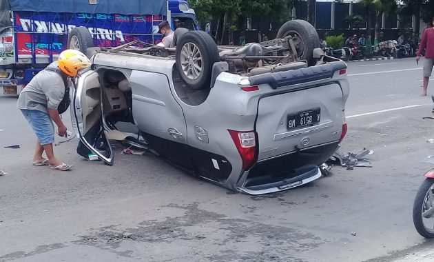 Mobil Xenia warna silver bernomor polisi K 8519 WB yang dikemudikannya sampai terbalik dan ringsek, setelah sebelumnya menabrak pohon palem di pembatas jalan hingga roboh.