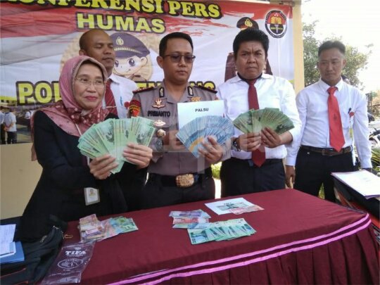 “Korban baru sadar kalau uang yang diberikan pelaku itu adalah uang palsu, setelah ada seseorang yang ingin menukar uang dengan pecahan Rp 20 ribu rupiah. Si penukar itu curiga, kalau uang milik korban itu tidak sama dengan Rp 20 ribuan yang asli, warnanya pudar, dan kusam,” kata Kapolres.