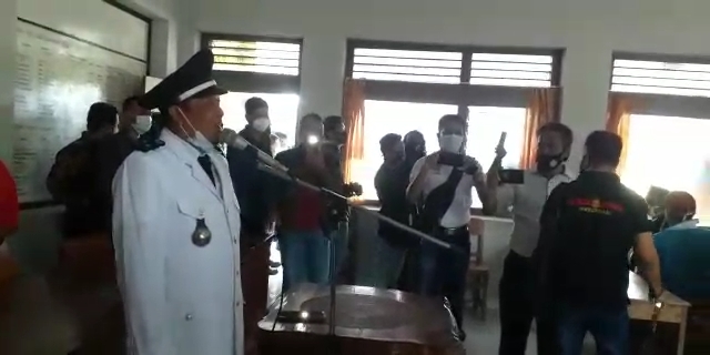 Ada puluhan warga yang hadir dalam pelaksanaan pelantikan tersebut dan berbuat anarkis dengan memecahkan dua kaca jendela balai desa.Petugas kepolisian dan TNI yang hadir pun kemudian mengamankan pelaku pengrusakan tersebut.