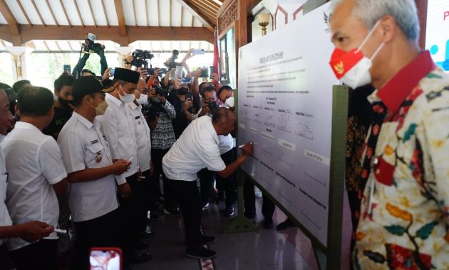 Pati – Kilaspersada.com, Bertempat di Pendopo Kabupaten Pati, Rabu (7/12), Gubernur Jawa Tengah Ganjar Pranowo, Pj Bupati Pati Henggar Budi Anggoro, Sekda Pati Jumani, Kapolres, OPD terkait, dan seluruh kepala desa serta lurah se-Kabupaten Pati menandatangani Pakta Anti Gratifikasi.