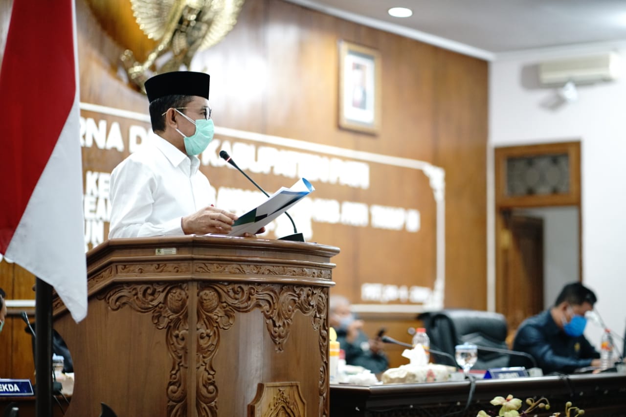 Rapat paripurna kali ini, dilakukan secara daring dengan menggunakan video conference, mengingat saat ini masih berada di tengah wabah Covid-19. Para anggota Dewan dan seluruh Kepala OPD mengikuti video conference dari tempat masing-masing. Hanya Bupati, Sekda, Ketua DPRD dan Wakil Ketua DPRD yang berada di ruang Paripurna. Namun pelaksanaan tetap menerapkan protokol kesehatan serta physical distancing.