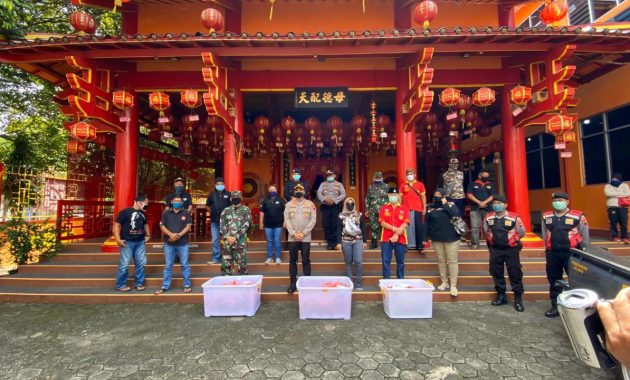 Kapolres Pati AKBP Arie Prasetya Syafa’at, SIK bersama Dandim 0718 Pati Letkol Czi Adi Ilham Zamani turun langsung pimpim pembagian sembako kepada pengguna jalan yang melintas di depan kelenteng Hok tik bio Pati Jalan MH. Thamrin.