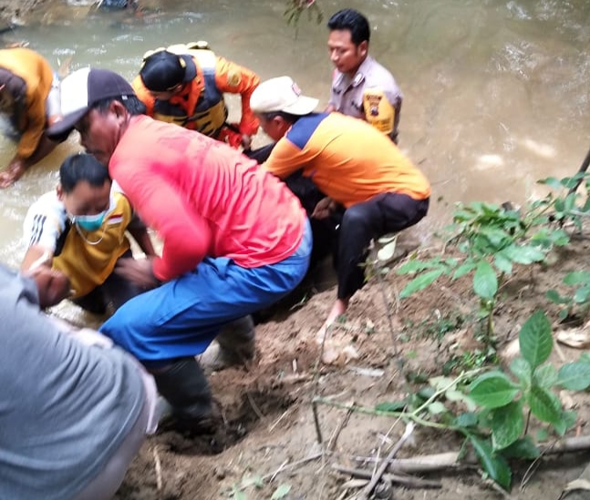 Relawan SAR, TNI-Polri dan warga melakukan evakuasi jenazah, selanjutnya Jenazah dibawa kerumah duka.