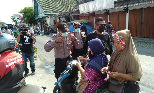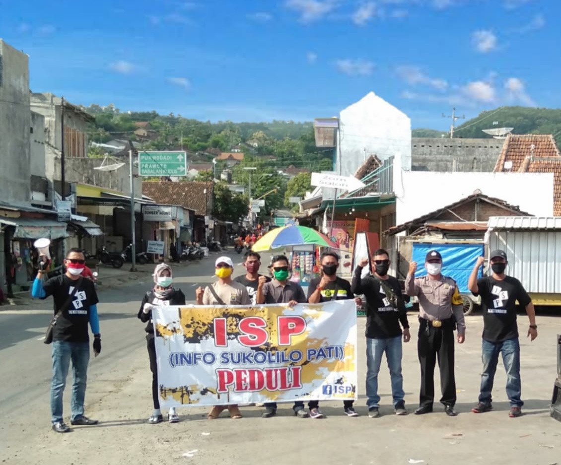 Pati – Kilaspersada.com, Komunitas ISP (Info Sukolilo Pati) bagi – bagi masker di depan pasar desa Sukolilo.
