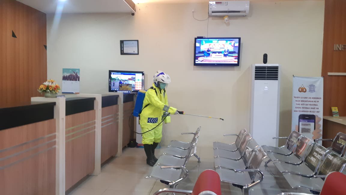 Penyeprotan tak hanya kendaraan dinas, seluruh lingkungan Mako Satlantas Pati baik luar ruangan maupun dalam ruangan tempat pelayanan SIM SATPAS Pati juga ikut disemprot dengan cairan disinfektan, tuturnya.