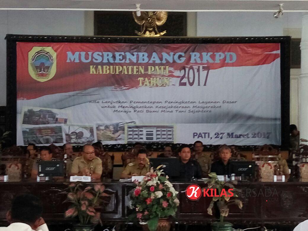 Pati- Kilaspersada.com, Senin (27/3/2017) Bertempat dipendopo kabupaten Pati telah dilaksanakan kegiatan MUSRENBANG RKPD tahun 2017 dengan tema “Kita Lanjutkan Pemantapan Peningkatan Layanan Dasar Untuk Meningkatkan Kesejahteraan Masyarakat Menuju Pati Bumi Mina Tani Sejahtera”. Kegiatan ini dihadiri kurang lebih 200 orang dari masing-masing jawatan pemerintah kabupaten pati.