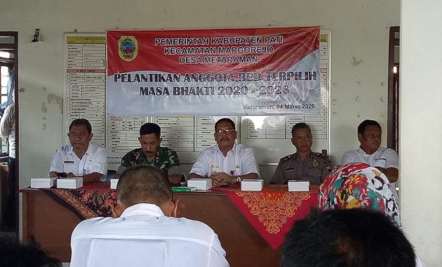 Pati – Kilaspersada.com, Pemerintahan desa Metaraman Kecamatan Margorejo melaksanakan Pelantikan dan Pengambilan sumpah BPD Desa Metaraman Periode 2020-2026 yang bertempat di Balai Desa Metaraman. Rabu, (04/02/2020)