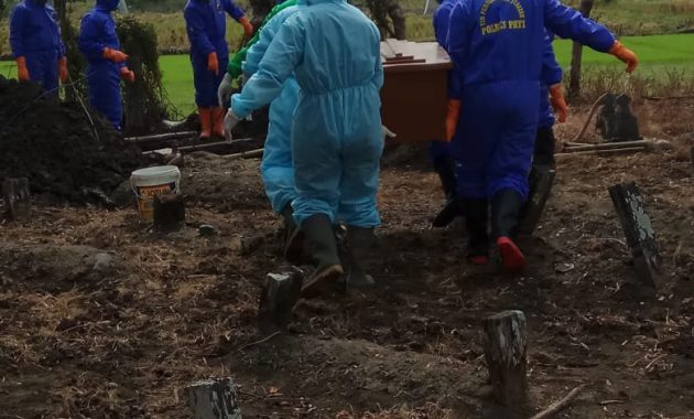 Proses pemakaman secara Protokol kesehatan Covid 19 dilakukan oleh team dari Tim Pemulasaran Jenazah Polres Pati dan RSUD Suwondo Pati dengan menggunakan Alat Pelindung Diri lengkap ( APD ) dikarenakan warga tidak berani memakamkan jenazah dikarenakan ketakutan warga apabila jenazah terkena Covid-19.