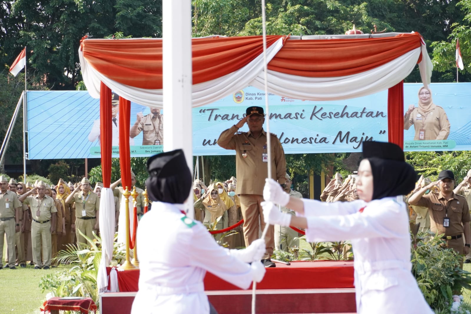 Kilaspersada.com Pati : Senin (13/11) bertempat di Alun-alun Kabupaten Pati. Pj Bupati Pati Henggar Budi Anggoro menjadi inspektur upacara dalam rangka memperingati Hari Kesehatan Nasional yang ke-59. Upacara tersebut diikuti perwakilan tenaga kesehatan (nakes) se-Kabupaten Pati.