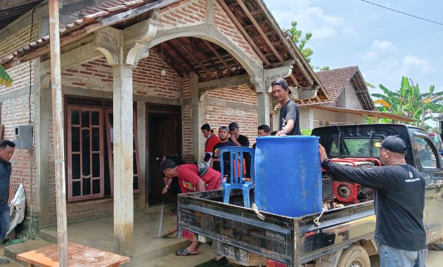 Setelah penyerahan bantuan dilanjutkan pembersihan rumah warga yang terdampak. Dengan semangat, Relawan Puser Bumi Pati kerahkan tangki air dan alat seadanya untuk membersihkan rumah warga untuk menyemprot lumpur yang masuk kerumah.