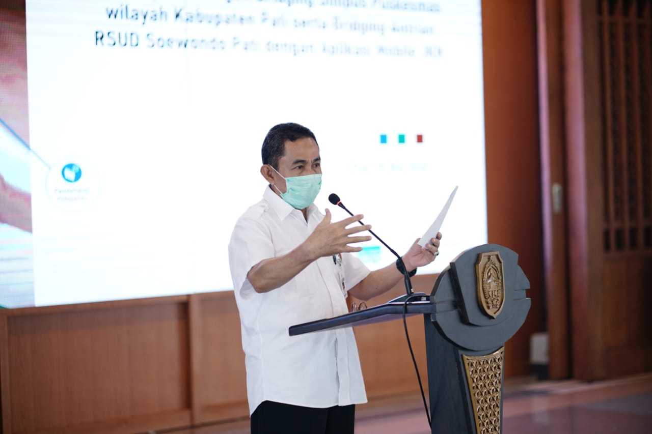 Pati – Kilaspersada.com, Bupati memberi penjelasan terkait dana realokasi dan refocusing APBD 2020 untuk penanganan Covid-19, usai Launching Sistem Antrian Online BPJS di Pendopo Kabupaten Pati (28/5).